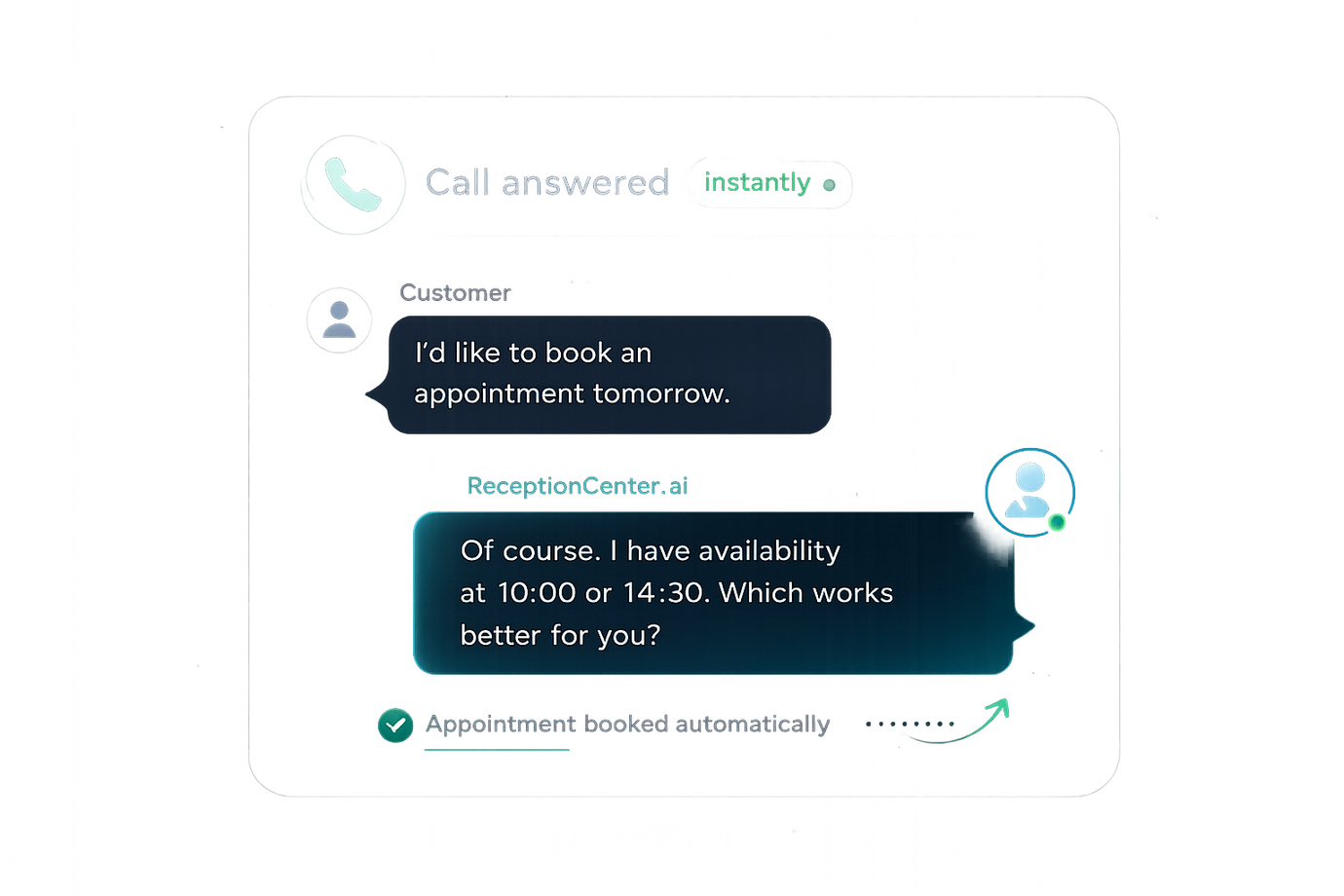 ReceptionCenter.ai answers every call to your business instantly. Our AI Receptionist speaks naturally with your customers, qualifies leads and books appointments automatically so you never miss an opportunity.